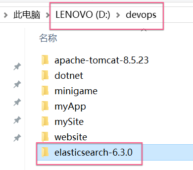 3、 然后将解压后的目录elasticsearch-6.3.0移动到你的开发环境目录,比如d:/devops目录;
