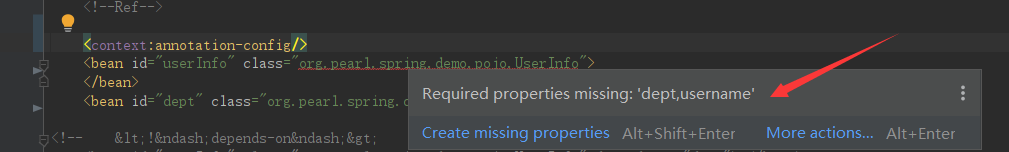 2、 然后在XML中注入该Bean,可以发现错误信息,必须注入该Bean被@Required注解标识了的属性;