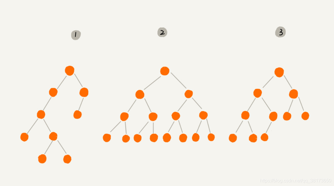 编号2 的二叉树中,叶子节点全都在最底层,除了叶子节点之外,每个节点都有左右两个子节点,这种二叉树就叫做满二叉树。
